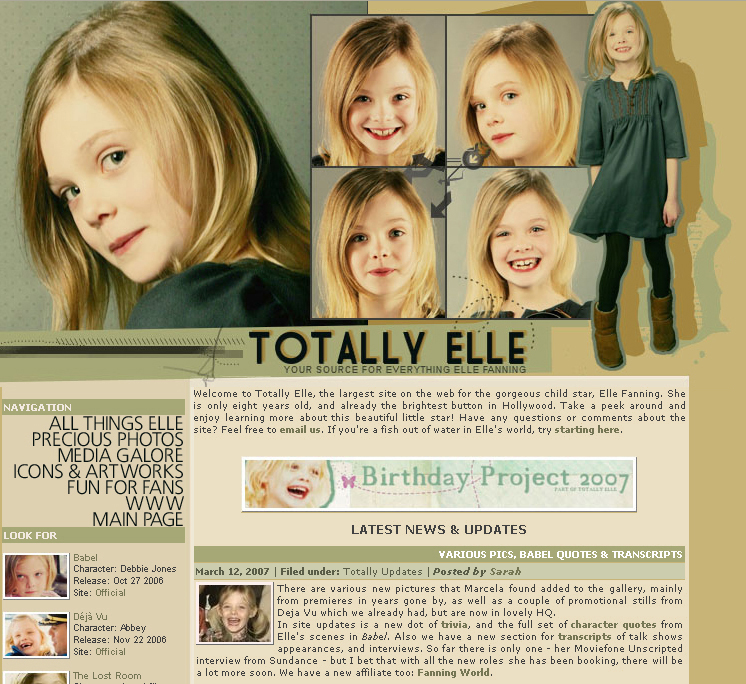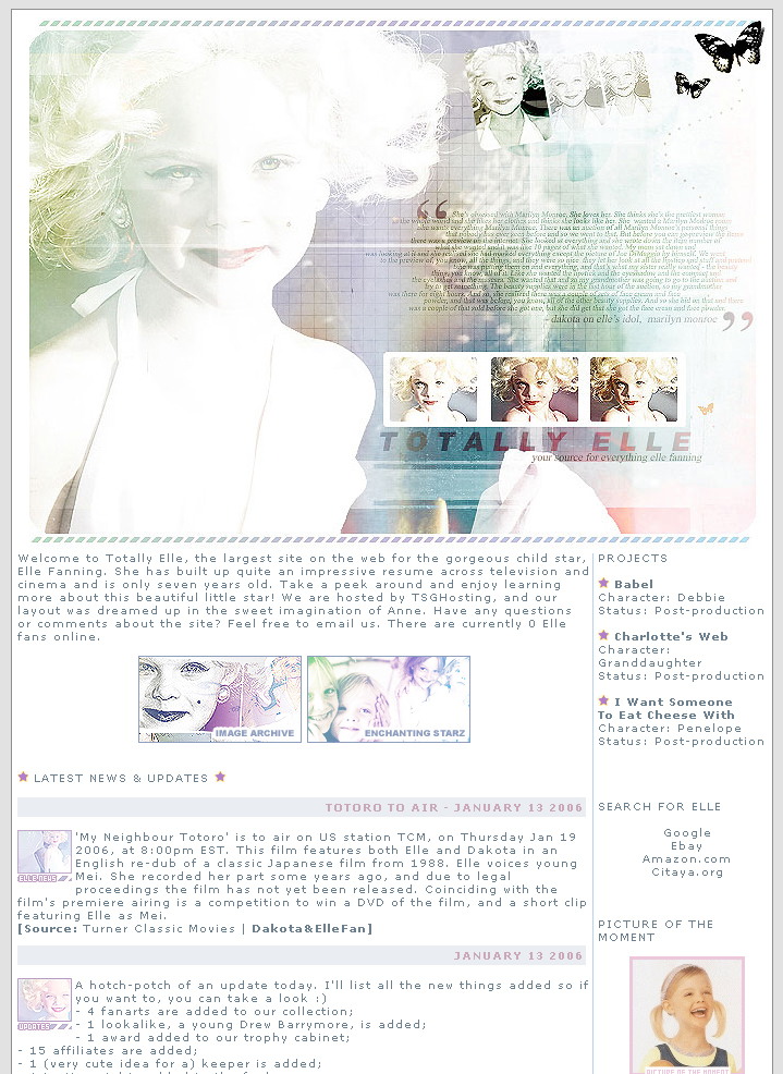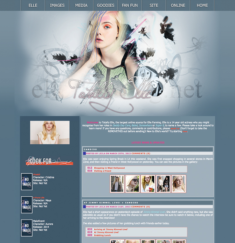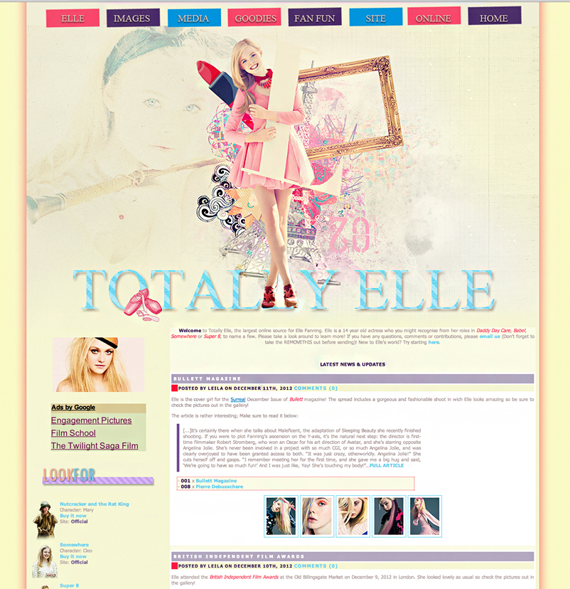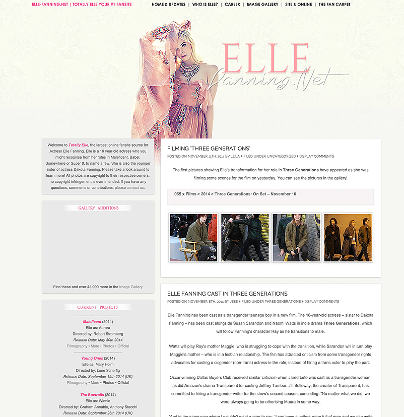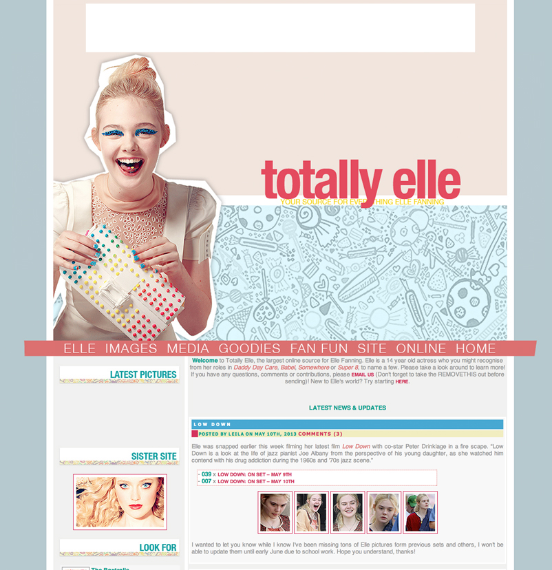 TOTALLY ELLE (www.totally-elle.com) is the original fansite for actress Elle Fanning, founded in 2003. Elle has been active in the entertainment industry since her debut as a voice actor in My Neighbor Totoro, in which she worked with her sister, Dakota Fanning. She has since starred in many projects, such as Maleficent, The Great and A Complete Unknown. We're not affiliated with Elle or her team, we just enjoy keeping up with her work. Thanks for visiting!